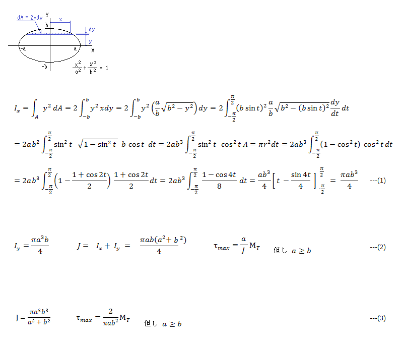 楕円の断面2次モーメント(慣性モーメント)Ix,Iy、及び極2次モーメント(ねじり定数)J の式は