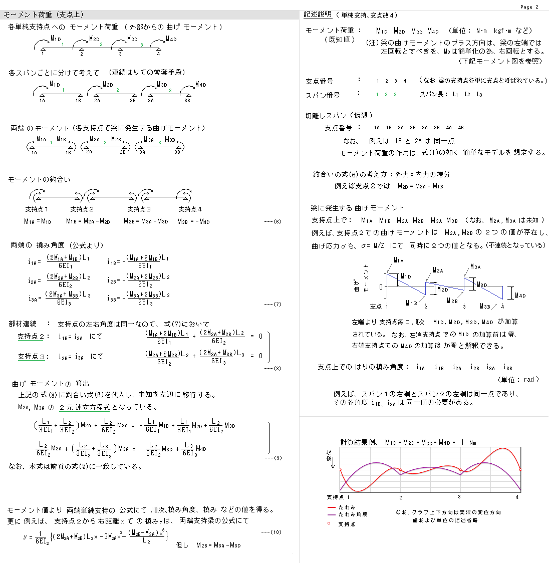 外部モーメント(モーメント荷重)を支点に受ける連続梁について、3モーメント法の式を誘導し、および撓み(たわみ)等の計算結果例を付記します。